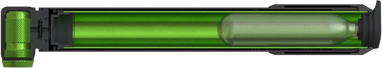 La mini bomba EDC de 100cc de OneUp Components tiene un volumen de aire de 100 centímetros cúbicos y bombea las cubiertas de MTB con válvula Presta hasta 3,5 bar. También es una buena alternativa si no quieres guardar la herramienta EDC o EDC V2 Tool en el tubo de dirección. Dispone de una cavidad en el asa en la que cabe el juego de herramientas Everyday Carry con sus cápsulas de almacenamiento grande y la pequeña integrada en esta. También puedes instalar un cartucho CO2 de 20 g en lugar del sistema de herramientas o junto la Tool, pero en este caso sin cápsulas. El cabezal de bomba en el otro extremo de los 100cc puede ser removida, haciendo de la bomba un inflador CO2.