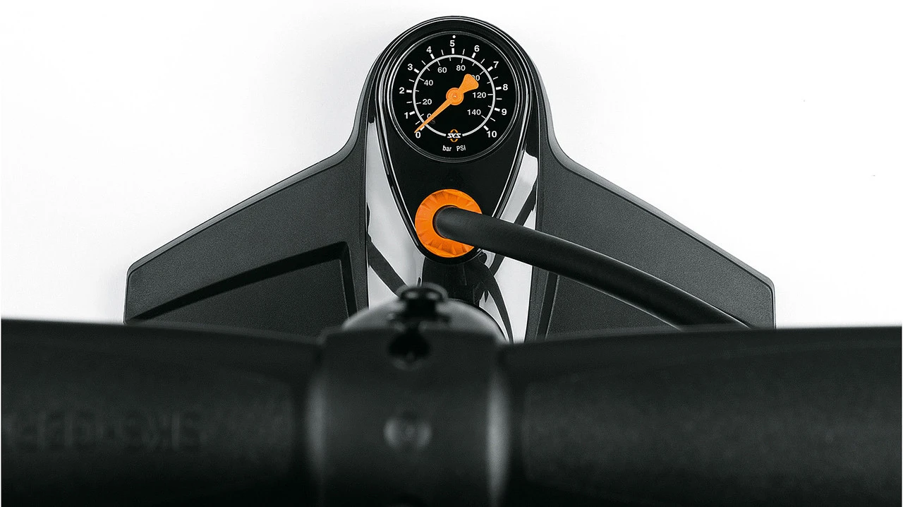 Bomba de pie de plástico, robusta y extremadamente ligera, con manómetro para un control preciso de la presión. Indicación en bar y psi. Fácil manejo gracias al probado cabezal de bomba SKS con palanca de sujeción. Bombea fácilmente hasta 8 bar / 15 psi.